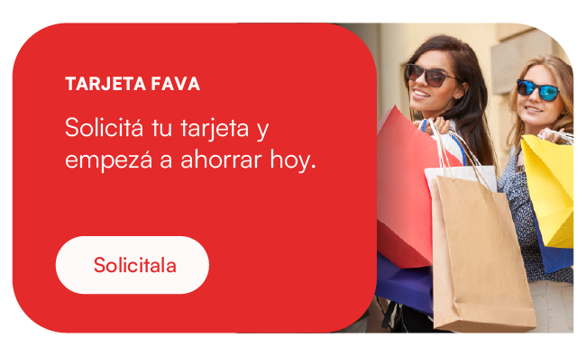 PROMO FAVA ALIMENTACIÓN : 15% de descuento clientes Favacard y 20% de descuento para clientes Trayectoria (más de 10 años de antigüedad) y cuotas (consultar en cada comercio participante la financiación disponible para la presente promoción). Vigente los días Viernes, Sábados y Domingos comprendidos entre el 01/04/2026 y el 30/04/2026 en comercios seleccionados del rubro alimentación. En consumos efectuados con tarjeta de crédito Favacard (excepto Favacard Cabal). Tope de reintegro en cada comercio participante: $ 13.000 para tarjeta Favacard y $ 17.333 para tarjeta Favacard Trayectoria (por cuenta por mes de la promoción). Los descuentos no son acumulativos.