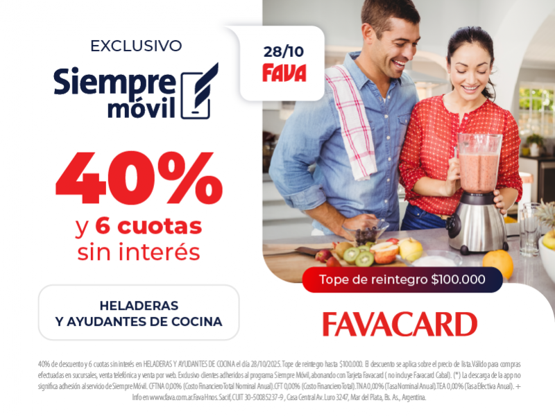 30 cupones para un 35% de descuento en lavarropas, cocinas y heladeras en 3 y 6 cuotas sin interés con Visa, Mastercard y Favacard para canjear en Fava.