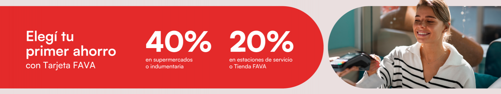 Promoción : 40% de descuento "exclusivo para nuevos clientes" en 1er. compra efectuada con Tarjeta Fava (se excluye Fava-Cabal) en un comercio del rubro alimentacion o indumentaria o, 20% de descuento "exclusivo para nuevos clientes" en 1er. compra en Tienda Fava o en rubro Estaciones de Servicio: